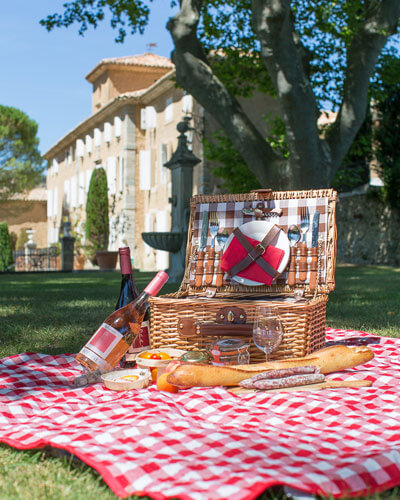 Take your seat – on the grass! Céline will give you a wicker basket and show you to a grassy terrace in the shade of three-hundred-year-old plane trees at the foot of the château.