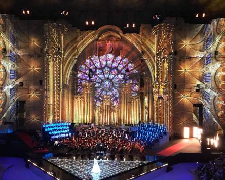 An eclectic musical soundtrack underpins the gigantic images, sometimes multicoloured, sometimes dichromatic, that adorn the theatre, from the backstage wall to the terraces and even the ground, moving from flute to electric guitar and pop sounds to electronic music. We adore the blend of genres, breaking down musical barriers to carry a universal humanist message!