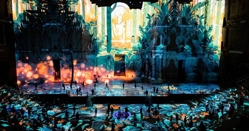 Try two new experiences at the same time through this new kind of show: acoustic excellence thanks to a spatialised, geolocated high-definition headset and visual immersion with monumental video mapping entirely generated by artificial intelligence and projected onto the whole of the Roman theatre. Thrills and sensations are guaranteed!"