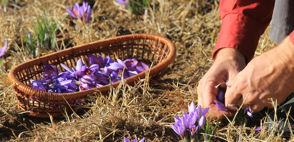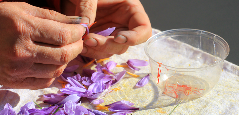 It is then that the saffron growers’ expertise comes into its own. As soon as the flower opens (which is always at dawn), it must be picked before it has time to dry up (which means right away, within the same day). With a basket under their arm, the saffron grower picks the flowers very carefully, by hand, enveloping each flower in the palm of their hand and cutting off the stem with their fingernail.