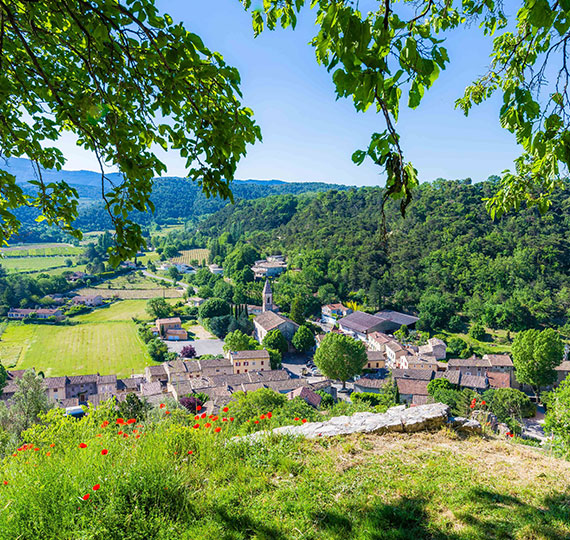 In Entrechaux, it’s in the forest, surrounded by the vineyards of Domaine Talès, where you will find the pretty cabins, looking at the ruins of the Castle that overlooks the village.
