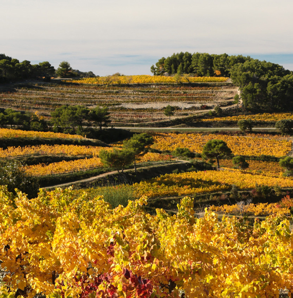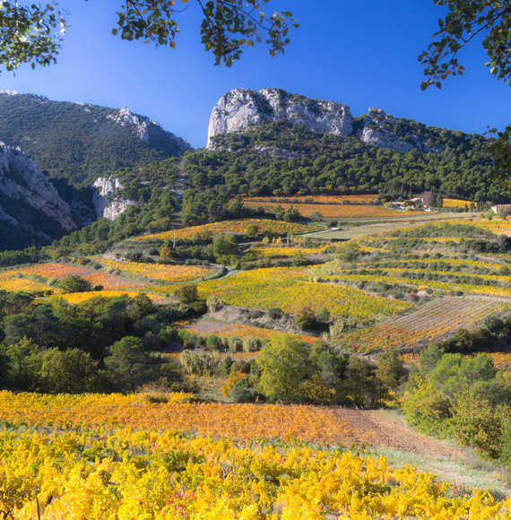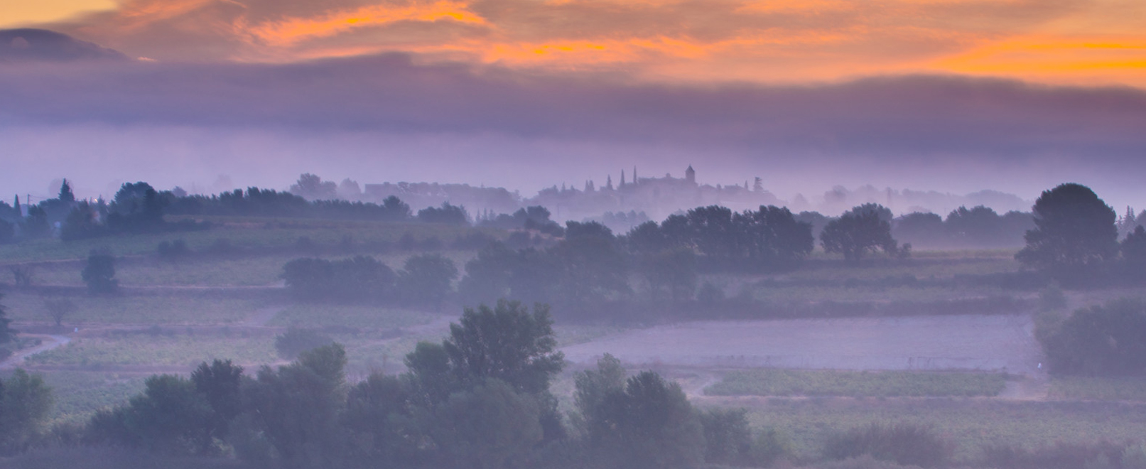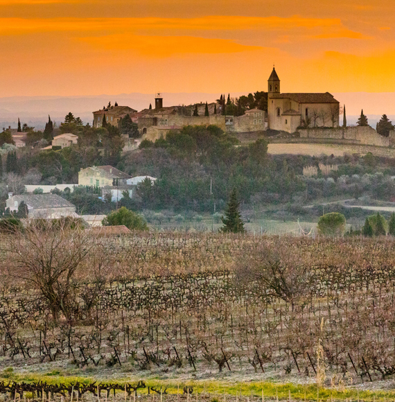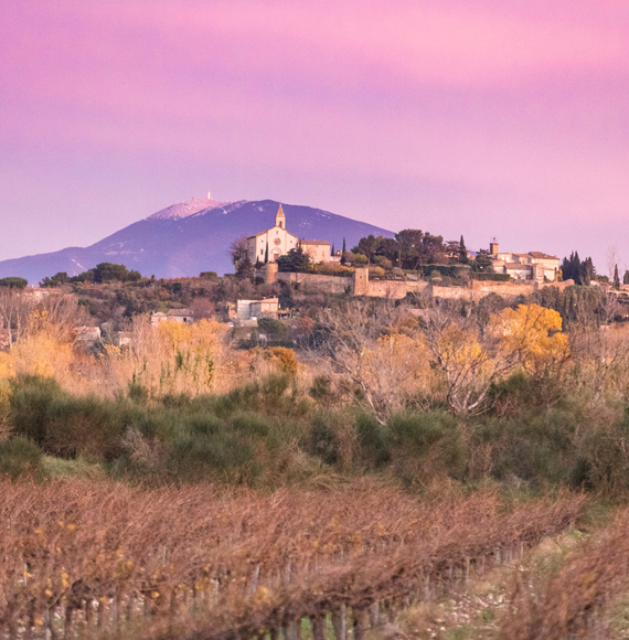 A golden belt around Mont Ventoux, the elegant train of the vineyards at the foot of the Dentelles, an amber dawn over Cairanne…