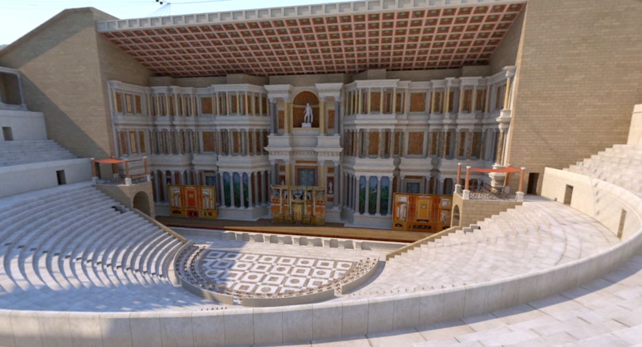 Before your very eyes, the ramparts are erected, the roads of the future Roman city are drawn out, the hill is converted to hold rows of seating, and, stone by stone, the theatre takes shape and unveils its majestic decor.